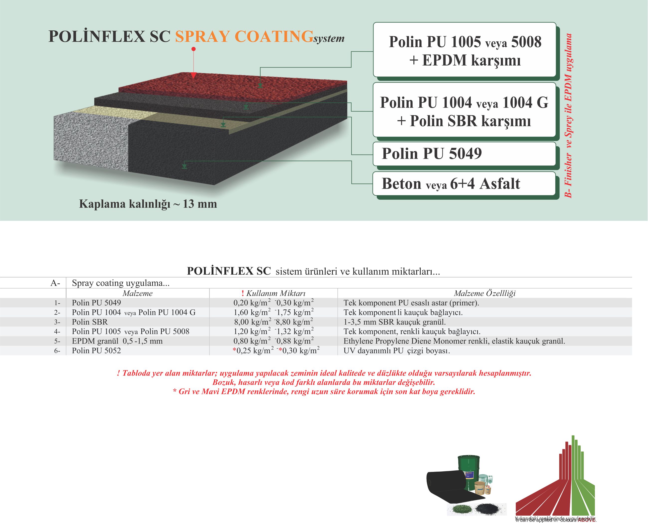 Amatör müsabakalarda ve antrenmanlarda, yürüme yollarında vb. alanlarda kullanılan ekonomik EPDM kaplama sistemidir. Darbe emici özelliği yüksek düzeydedir. Darbe emici alt tabaka; Polin SBR ve Polin PU 1004 veya Polin PU 1004 G karışımı asfaltlama makinesi ile uygulanır.  Son kat EPDM kaplama; 0,5-1,5 mm kalınlıktaki EPDM granülleri, Polin PU 1005 renkli bağlayıcı veya Polin PU 5008 karıştırılarak sprey makinası ile zemine uygulanır.